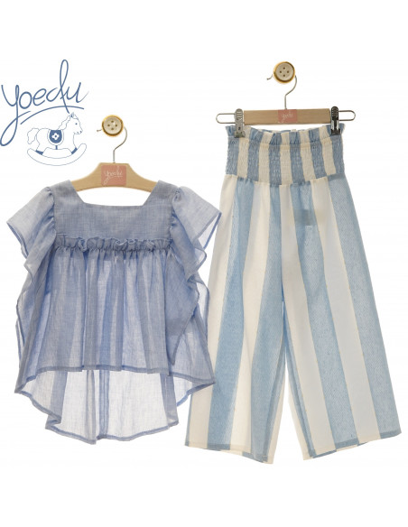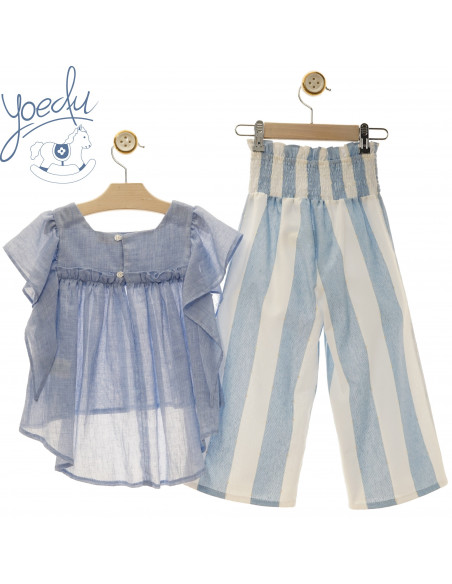 Conjunto verano niña pantalón culotte franjas azul y blanco con blusa vaporosa asimétrica celeste empolvado. Ideal para ceremonia o invitada de comunión. Familia Arrecife de Yoedu