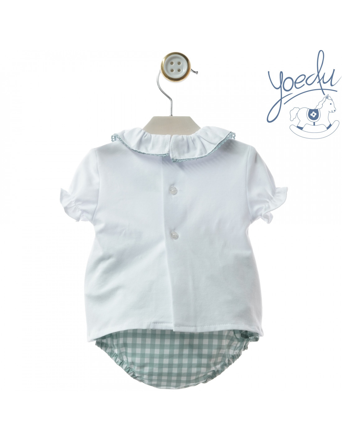 Conjunto verano bebé niña camiseta estampada; ranita con volante y gorro en vichy verde. YOEDU