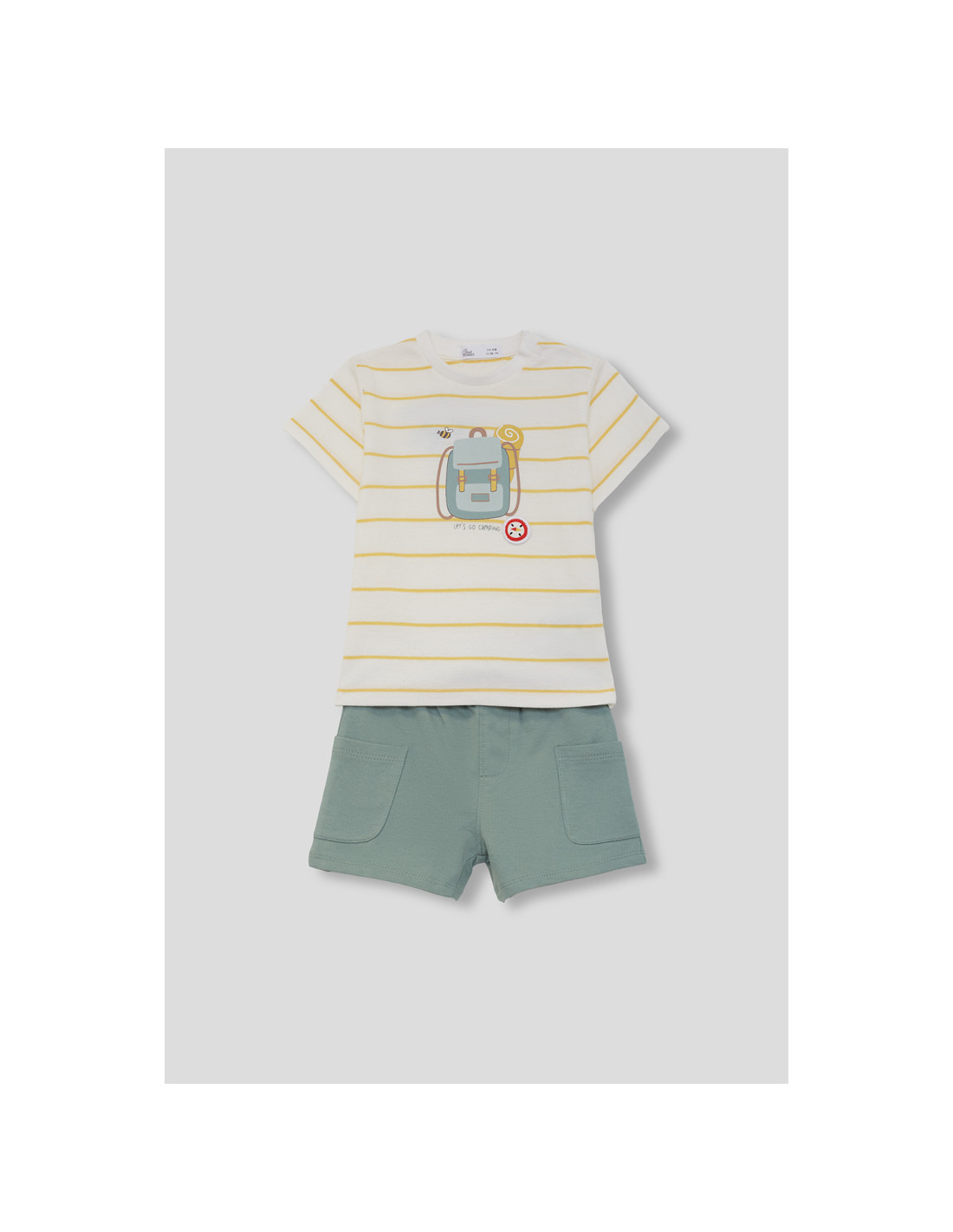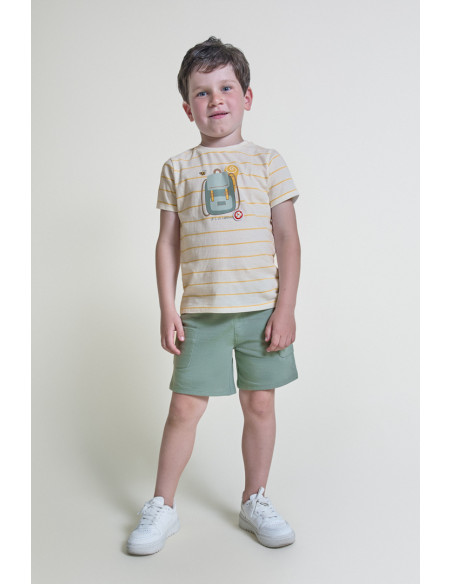 Conjunto deportivo corto en algodón camiseta rayas amarillas con estampado de mochila y pantalón corto verde. STREET MONKEY
